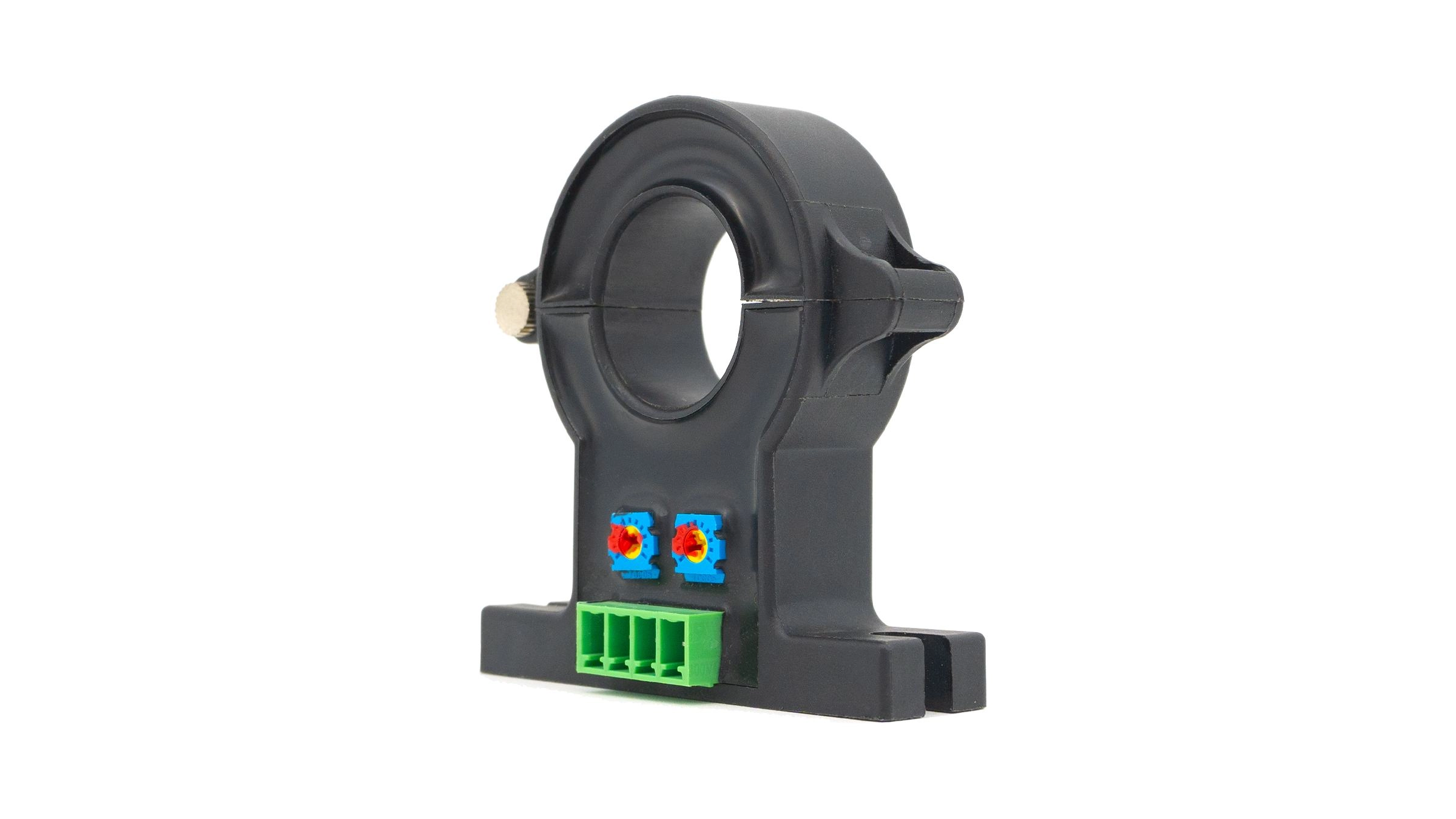 Cette image montre un transmetteur de courant typique utilisé pour mesurer le courant électrique dans les circuits.